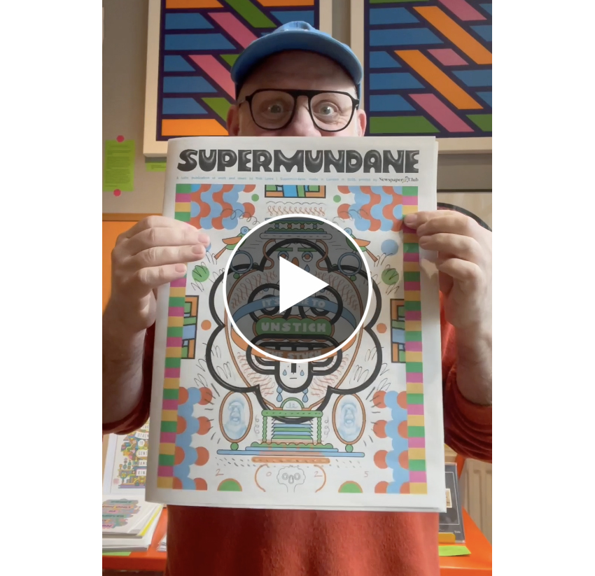 Rob Lowe – aka Supermundane – is a London-based artist and designer known for his bold geometric patterns and careful line work. With roots in graphic design, precision is usually baked into his process. But when we offered him 50 copies of our digital tabloids to do whatever he liked, he took it as a chance to loosen up.